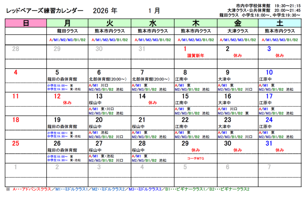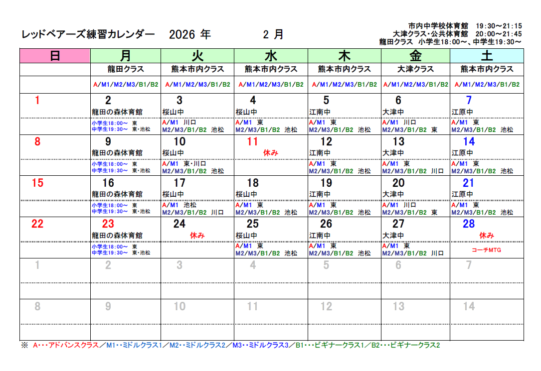 日曜:西合志東学校 17時15分~18時45分